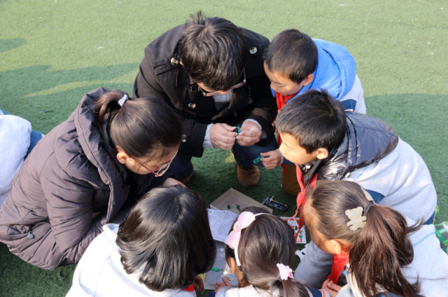 短短半小时的科技创新作品展示显然让小朋友们意犹未尽,跃跃欲试。志愿者们又在操场上,带领小朋友们手工拼装四驱车。所有人一起参与其中,非常有兴趣,氛围融洽。小朋友们虽然年龄小,但在志愿者们的分工和指导下,有的装车身、有的装车轮,有的研究说明书……俨然是一个分工有序的团队,那份认真、那份热情,也感染了在场的所有志愿者。