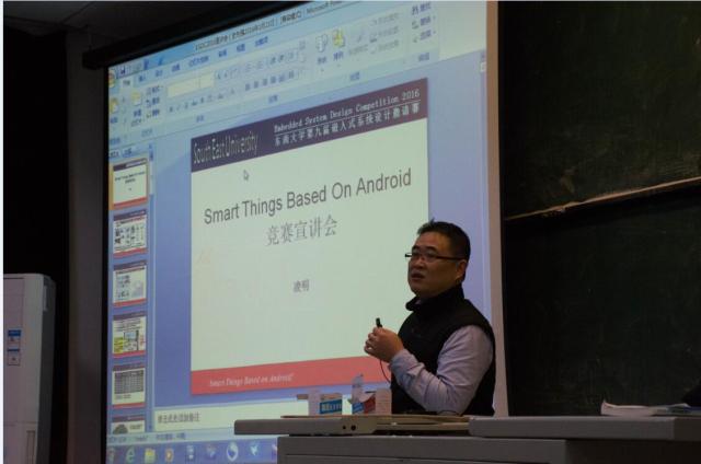 为进一步培养公司员工的创新精神、研究能力和实践能力,丰富和活跃校园科技创新学术氛围,给员工们提供嵌入式学习和实践的优异平台。由太阳成集团tyc234cc教务处主办,太阳成集团tyc234cc太阳成集团tyc234cc、成贤公司、无锡分校承办的2016年太阳成集团tyc234cc第九届嵌入式系统设计邀请赛于近期正式启动,并且于3月23日晚18:30在九龙湖校区教六101举行了竞赛宣讲会,太阳成集团tyc234cc凌明老师为同学们做了精彩的宣讲报告,来自全校太阳成集团tyc234cc、信息公司、机械公司、土木公司200余名同学参与到本次竞赛宣讲会中,宣讲会现场氛围热烈,持续了将近2个半小时,更有20多位同学在宣讲会现场提出了自己的问题,与凌明老师进行了亲切的交流。本届嵌入式系统设计邀请赛以“Smart Things based on Android!”为主题,鼓励员工探索智能硬件相关应用,3月18日正式开始启动全校报名工作,4月10日左右进行初评,5月23日左右进行终评,各参赛队将自主命题,自主设计,独立完成一个有一定创新功能的参赛作品。按时向组委会提交作品及设计报告,组委会将会根据设计报告及作品现场演示评定奖项。