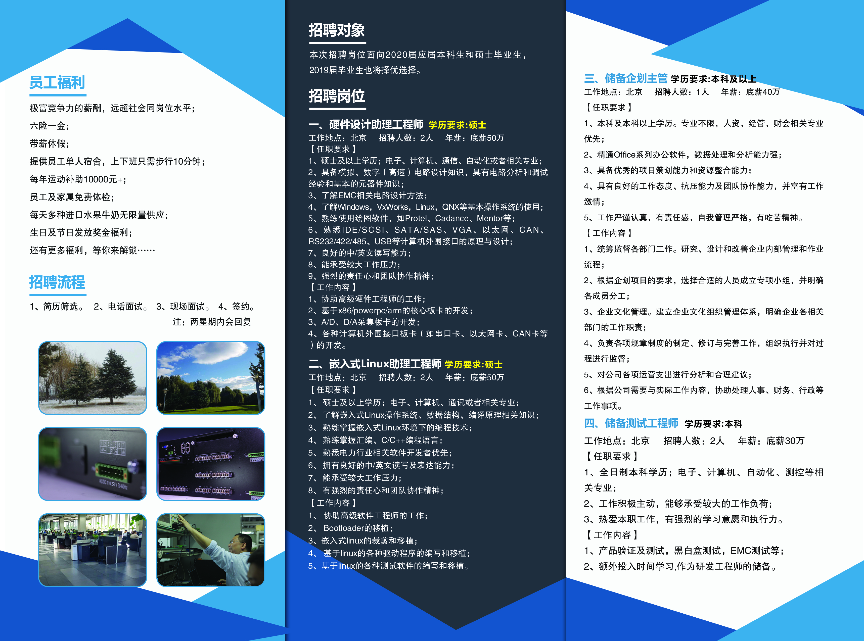 硬件设计助理工程师、嵌入式Linux 助理工程师,年薪50万起;储备测试工程师,年薪30万起;储备企划主管,年薪40万起。在京均提供舒适单人间宿舍,步行10分钟上下班。每日进口水果、饮品,无限量供应。每周登山/瑜伽/跑步等团建活动。虚位以待,勇敢来投!