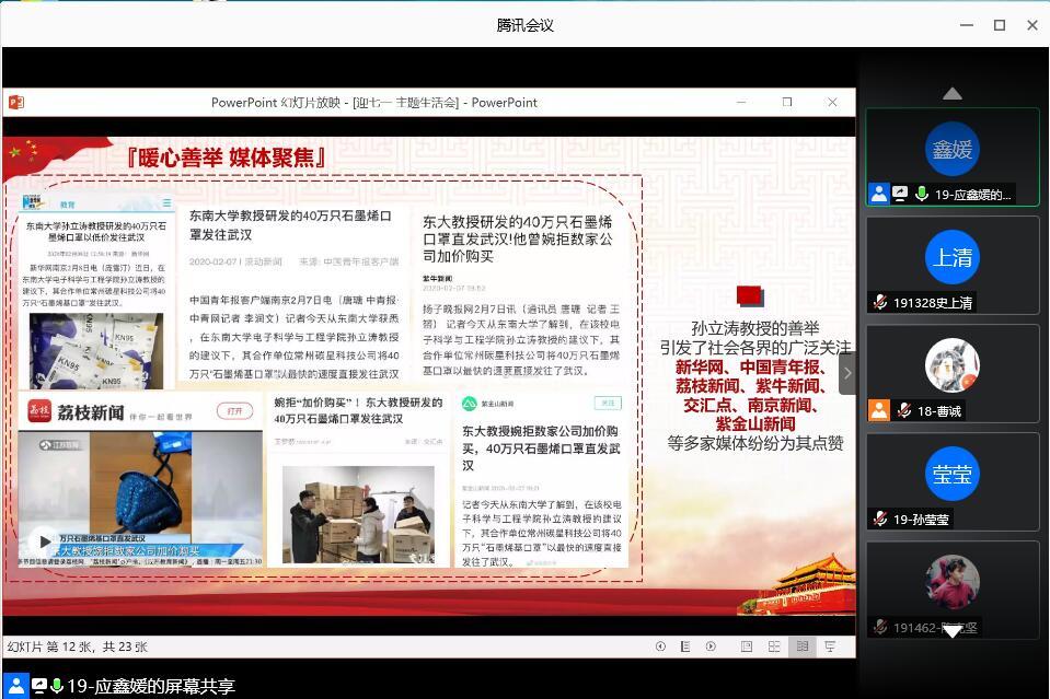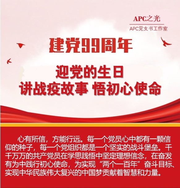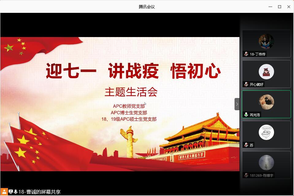 “牢记初心使命,决胜全面小康”。“七一”来临之际,为充分发挥基层党组织战斗堡垒作用和师生党员先锋模范作用,通过讲述疫情中的故事来更好地领悟初心使命,APC教师党支部、博士生党支部、18&19级硕士生党支部联合举办了本次“迎七一、讲战疫、悟初心”主题生活会。