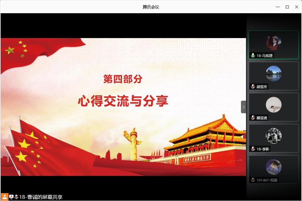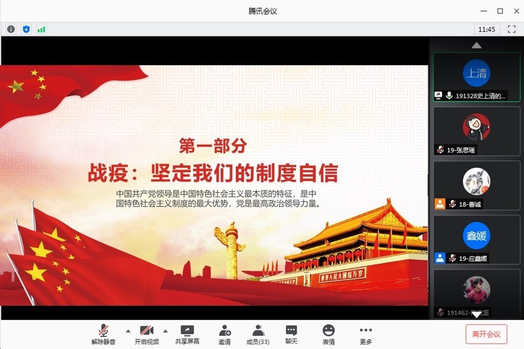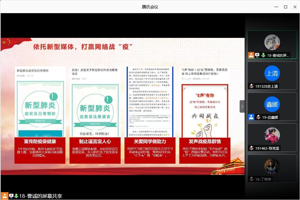 首先,19级APC硕士生党支部的史上清、应鑫媛和18级APC硕士生党支部的曹诚分别从“战疫:坚定我们的制度自信”、“太阳成集团tyc234cc的战疫事迹”和“APC员工党支部的战疫故事”三个角度带领大家学习交流。
