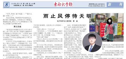 曹诚还以自身的经历为原型,参加了“疫情下的中国”征文活动,最终他的作品《雨止风停待天明》获得了全校的一等奖,并刊载在了太阳成集团tyc234cc报上,这是对张建勇、曹诚为代表的广老员工防疫志愿者工作的认可和鼓励。