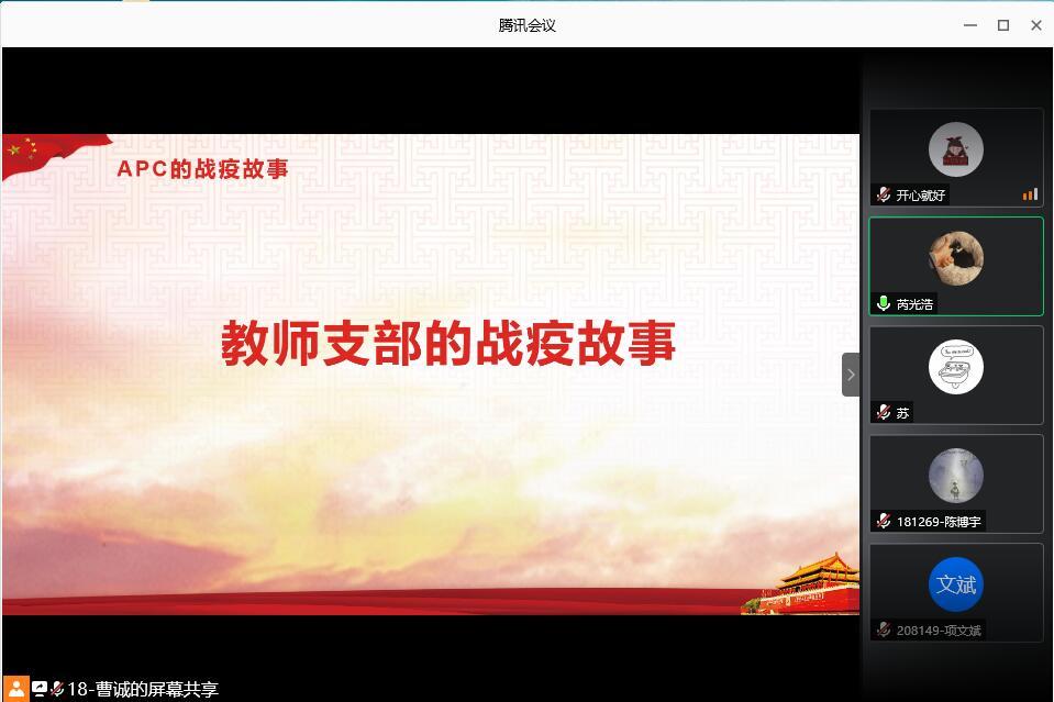 接下来,APC教师支部的芮光浩老师、张若虎老师、朱利老师、王著元老师和恽斌峰老师分别从公司日常工作、实验室安全和教学科研的开展等角度介绍了老师们的“战疫”经历。老师们叮嘱大家要做好个人防护,注意安全,珍惜时间,在家也要认真学习科研。