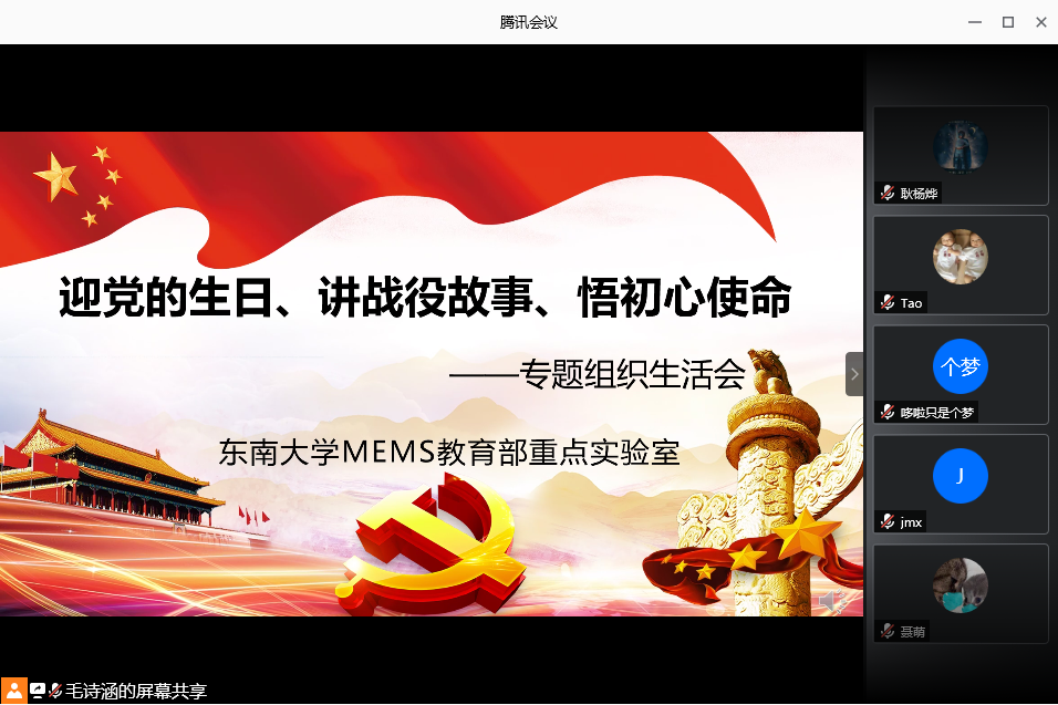 2020年6月30日晚,太阳成集团tyc234ccMEMS教育部重点实验室教师党支部联合18&19级硕士生党支部以及博士生党支部线上开展了以“迎党的生日,讲战疫故事,悟初心使命”为主题的组织生活会。MEMS实验室的十几位教师党员以及各年级员工党员参与了此次组织生活会,本次会议由毛诗涵同学主持。