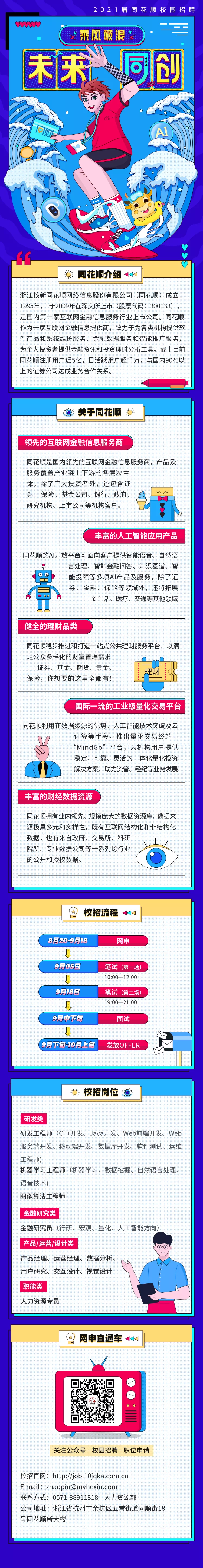 浙江核新同花顺网络信息股份有限公司是国内产品类别最为全面的互联网金融信息服务商,同时也是国家规划布局内重点软件企业、国家信息化试点工程单位。公司成立于1995年,并于2009年在深交所上市(股票代码:300033)是国内第一家互联网金融信息服务行业上市公司。我们具有行业内最为齐全的产品线及完整的产业战略布局,涵盖了金融信息服务、移动证券平台、基金销售、人工智能投资、大宗商品经纪等业务领域,通过创新的产品和服务,持续满足国内90%证券机构与近两亿的个人客户的需求。