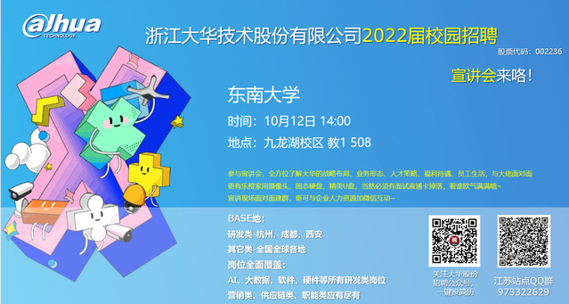 诚邀各位同学前来参加,大华股份研发高层及HR亲临现场交流,参与宣讲会现场交流抽奖惊喜多多,