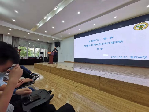 随后,支部师生来到了江苏省淮安中学,与高一员工进行对话交流,开展了融爱国、科研、创新为一体的科普活动和精彩报告。时龙兴教授首先以“五爱”作为开场,引导同学们从“大家”到“小家”,注重从不同角度对自己的未来择业进行思考和规划。徐申教授围绕当前集成电路发展的角度,作了“从沙子到芯片”的科普报告。齐志教授从人工智能和机器学习的角度给同学们进行了相关知识的入门介绍。活动现场互动频繁,老师们的精彩报告得到同学们的热烈鼓掌,报告结束时,现场同学们意犹未尽,纷纷流露出依依不舍的表情。