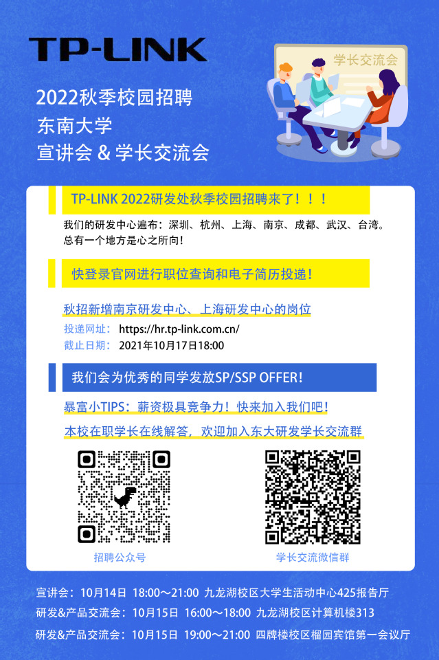 【TP-LINK】2022届校招全面启动,招聘职位覆盖研发类、产品类、国际业务类、制造类等八大类岗位,工作地点可选择深圳、杭州、成都、武汉、南京、上海、东莞、珠海、海外等,全国招聘人数2000人以上,欢迎同学们投递简历。