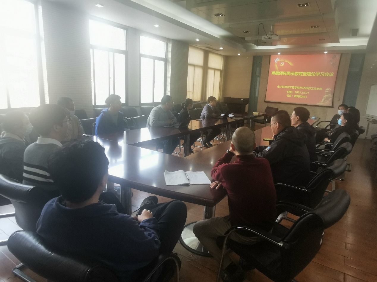 2021年10月27日,MEMS教工党支部在南高院404会议室召开警示教育大会。支部书记易真翔首先传达了公司和公司党委关于师德师风的指示和要求,之后,组织大家学习了纪委下发的警示教育学习资料,并对7个警示案例逐一讲解并剖析。与会党员同志纷纷发言,并表态一定要严格遵守教育部和江苏省的各项规定,洁身自好、以德树人,做好高等院校教书育人工作。