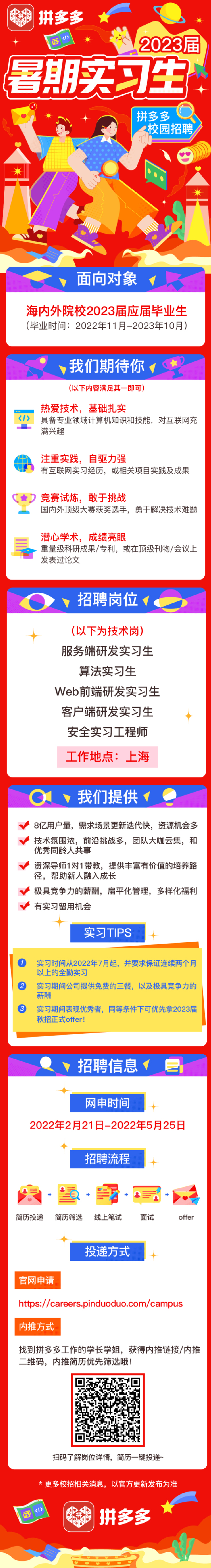 【拼多多】2023届暑期实习生——技术岗位开始招聘啦~有实习留用机会哦!!