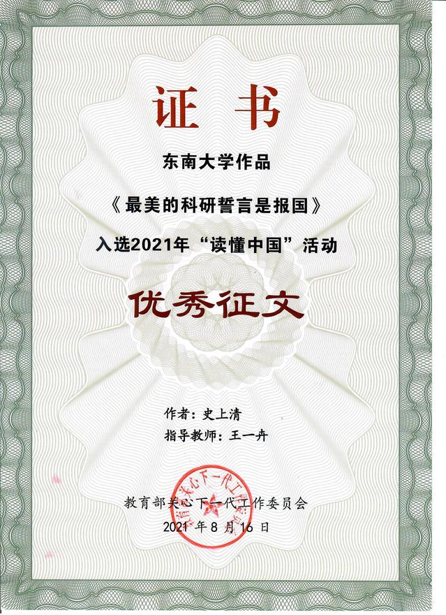 会上还对2021年教育部关工委和省关工委获奖师生进行了表彰。公司研究生史上清同学的作品《最美的科研誓言是报国》(指导老师:王一卉)入选2021年教育部关工委“读懂中国”活动优秀征文。