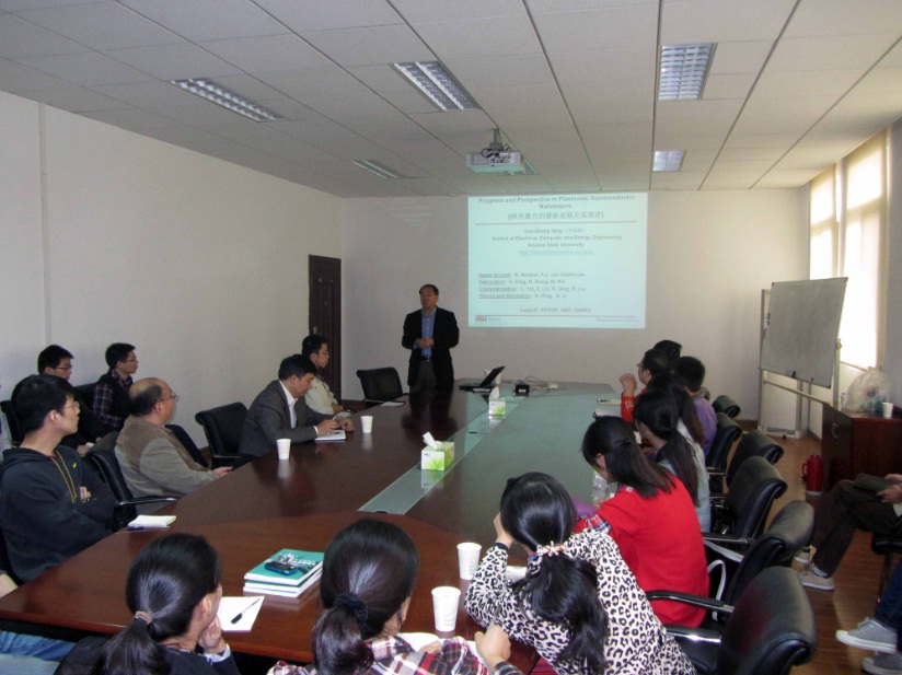 On October 24th, Southeast University Student Chapter of OSA (The Optical Society) invited Prof. Ning Cunzheng from Arizona State University to visit Advanced Photonics Centre. Prof. Ning delivered a speech entitled "Progress and Perspective in Plasmonic Semiconductor Nanolasers" to report the recent advances and interst in this research area. He also visited our lab and made academic exchange with our faculties and students.